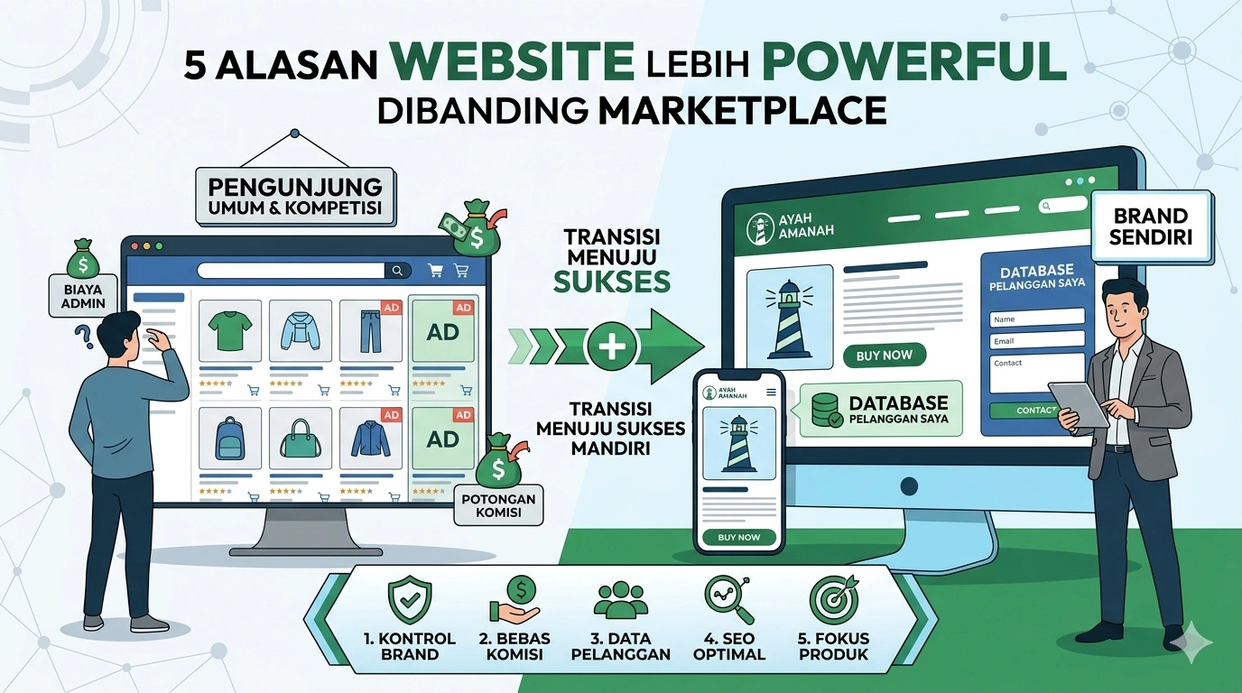 Banyak penjual mengeluhkan biaya admin yang terus naik dan algoritma yang sulit ditebak. Inilah saatnya memahami 5 alasan website lebih powerful dibanding marketplace agar bisnis Anda memiliki pondasi yang jauh lebih kokoh dan mandiri di masa depan.
